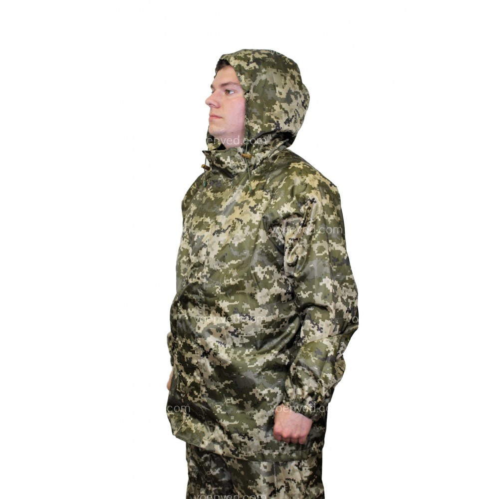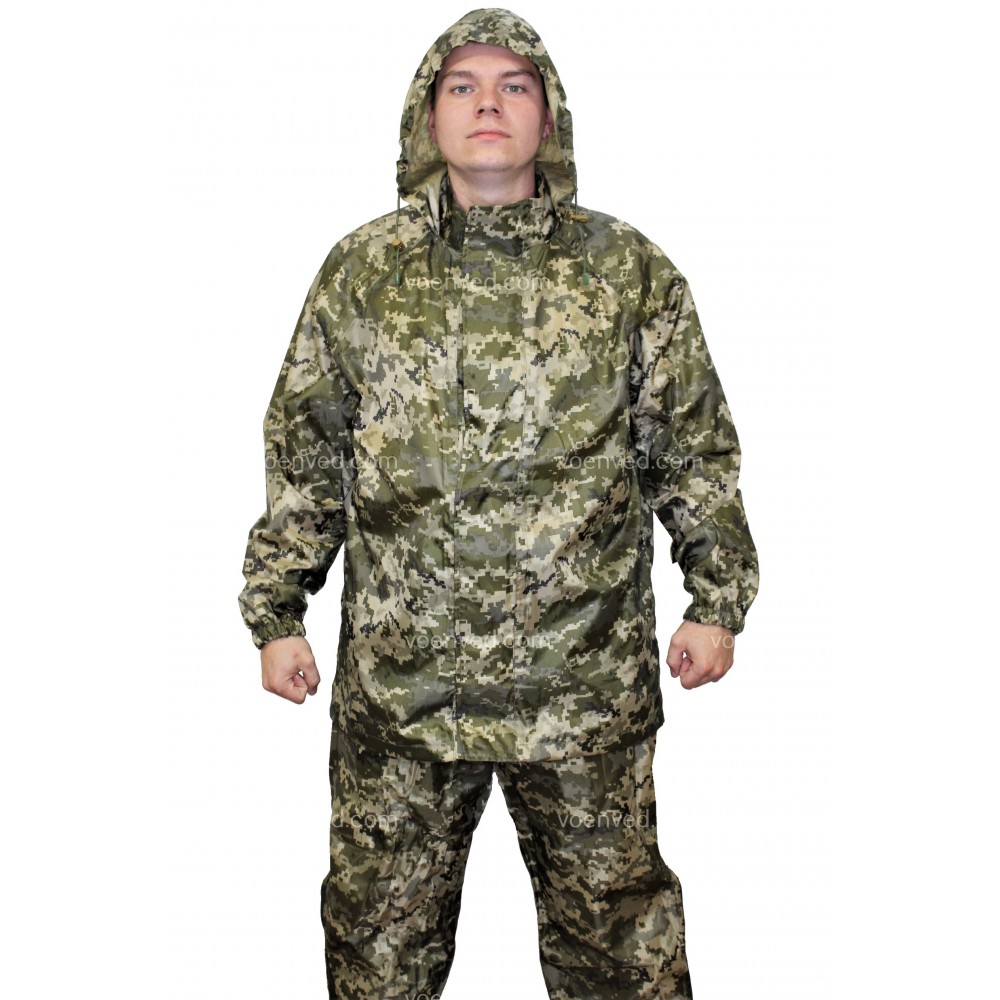 Костюм ЗСУ дощовик статутний вітро-вологозахисний демісезонний ЗСУ – дощовик універсального камуфляжного забарвлення складається з куртки та штанів, виготовлених з тканини ПВХ нейлон. Одягається поверх одягу, захищаючи його від промокання в негоду. Тканина 100% нейлон просочена спеціальним складом на основі полівінілхлориду. Склад надає тканині якості повної водонепроникності. Усі шви додатково проклеєні зсередини захисними стрічками води. Шви костюма подвійні, вони зроблені таким чином, що навіть за повної втрати тканиною водовідштовхувальних властивостей воду вони не пропустять. Куртка, що застібається на пластикову блискавку, захищена від дощу клапаном для повної гідроізоляції по всій довжині з текстильною застібкою-липучкою. Високий комір також фіксується липучкою. Для доступу до нагрудної кишені одягу є проріз - липучка, що закривається на застібку. Просторий каптур затягується на обличчі за допомогою капронового шнура із фіксаторами. Розмір каптуру дозволяє носити під ним будь-який головний убір і навіть захисний шолом. Штани утримуються на талії за допомогою двох широких вшитих резинок. Наявність блискавок внизу штанів дозволяє натягнути їх поверх взуття. Костюм упакований у сумку для транспортування. На сумці для транспортування є дві петлі, що дають змогу носити сумку на ремені штанів
