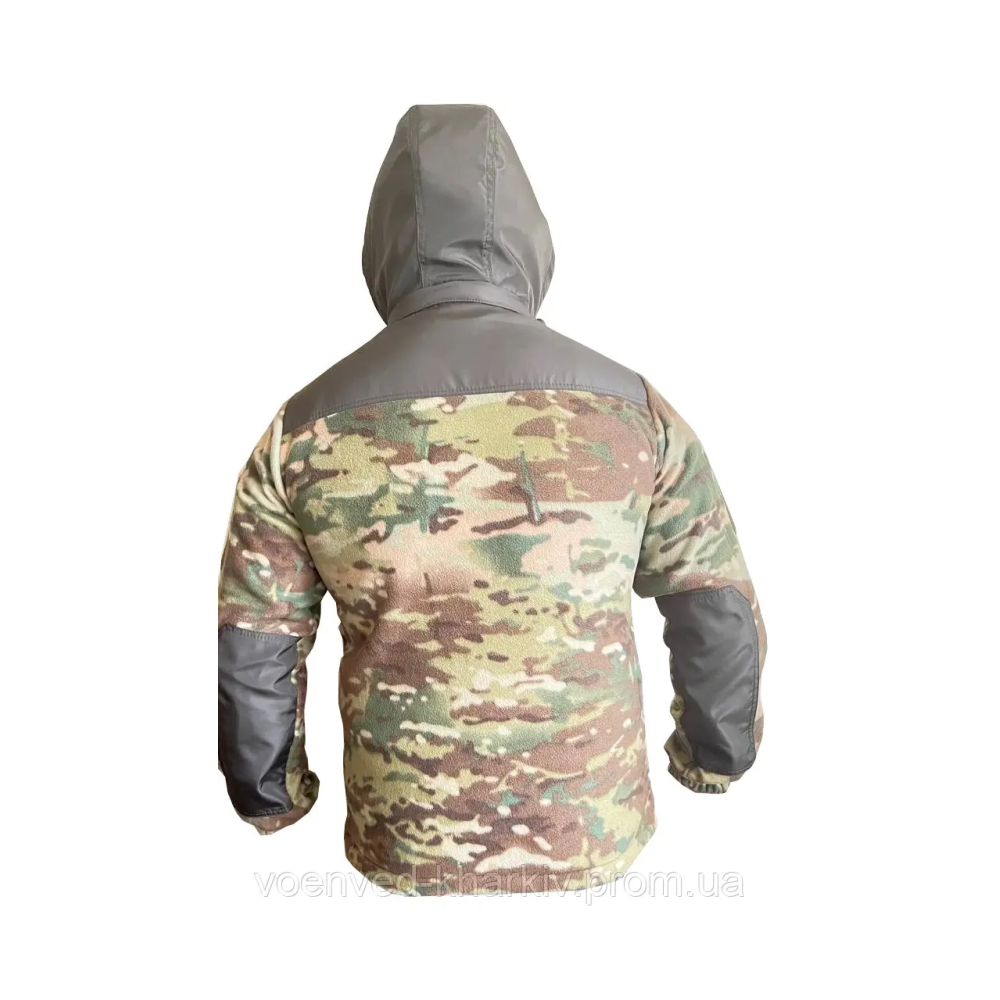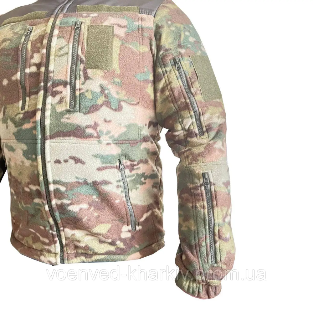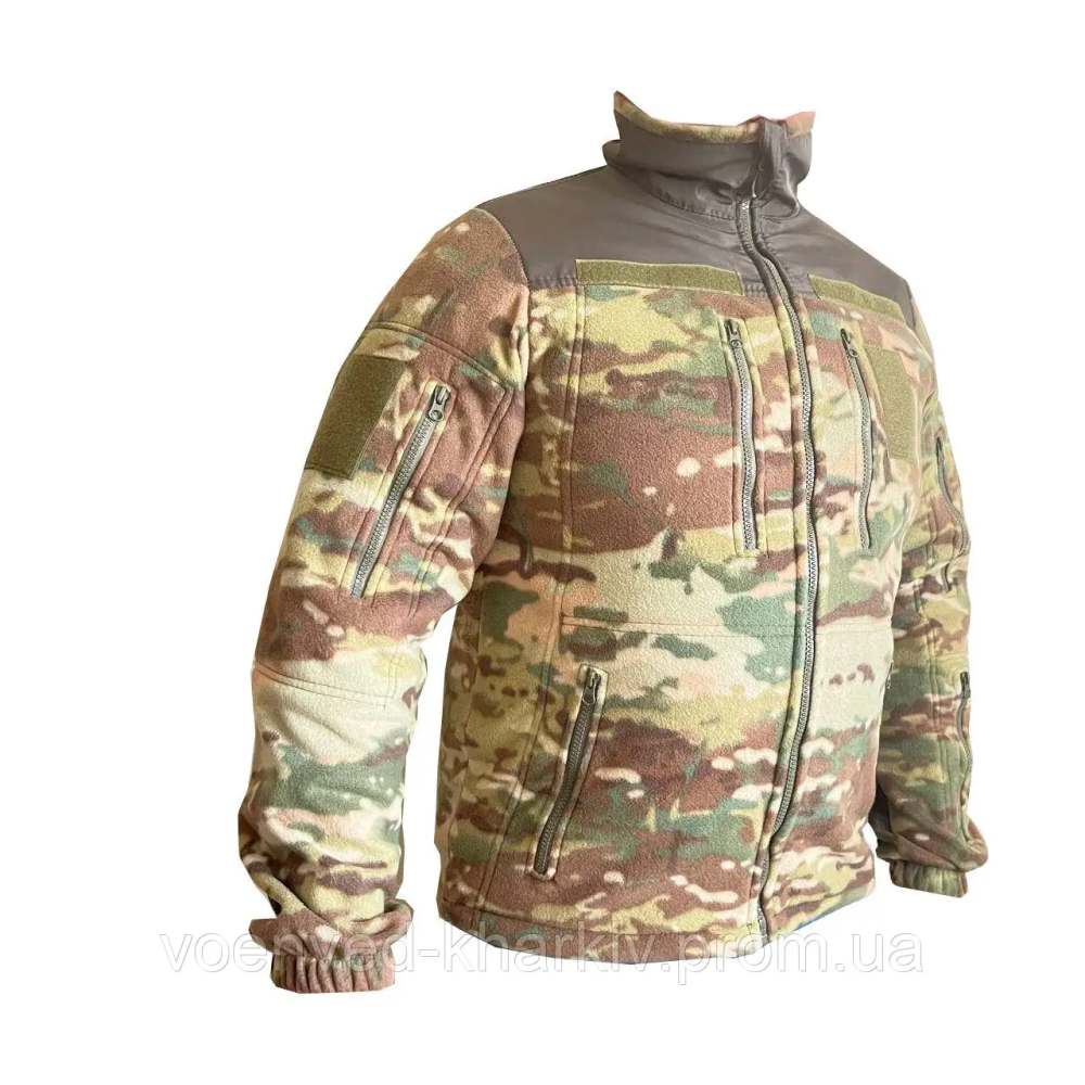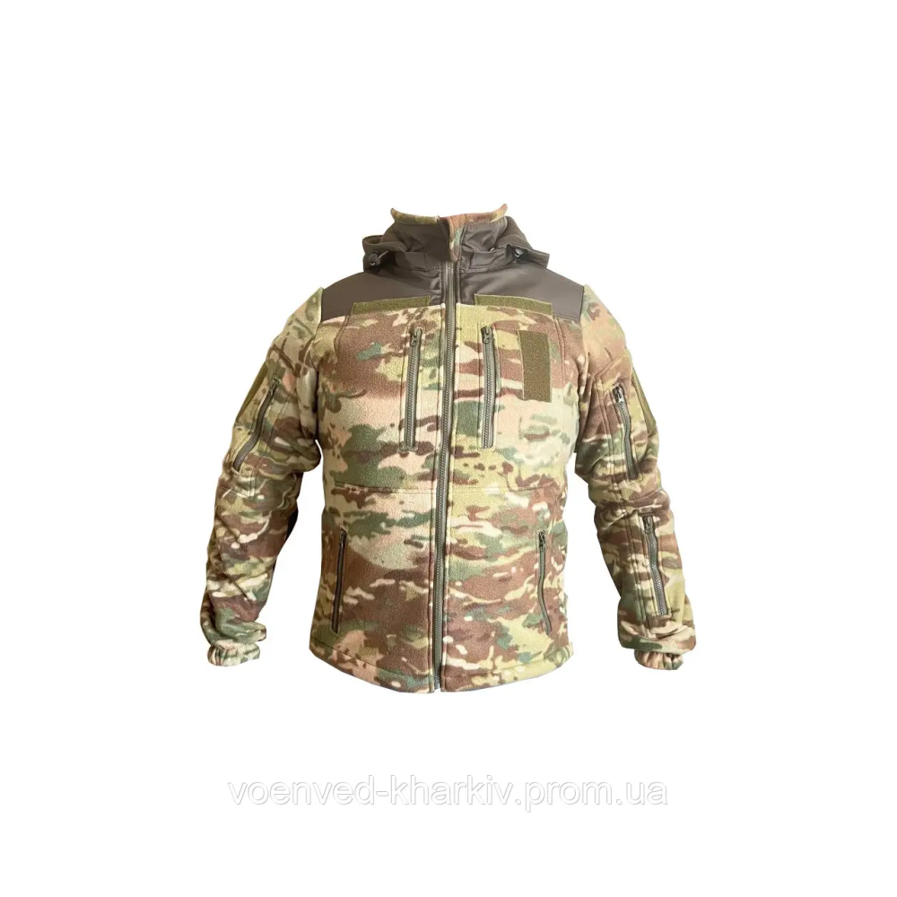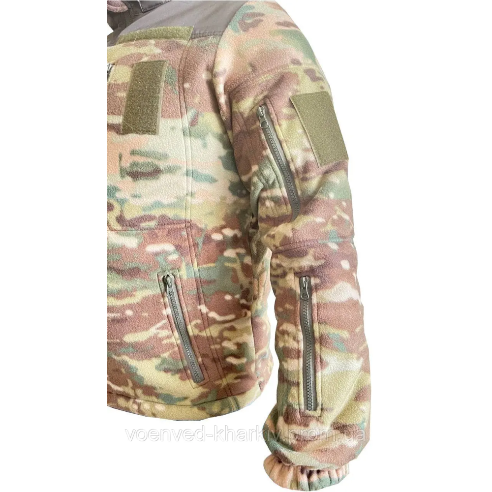 Тепла, м'яка флісова тактична кофта ЗСУ в кольорі мультикам на блискавці з капюшоном, який на змійці, з високим коміром, виготовлена з тканини фліс щільністю 290 г/м2 -завдяки унікальним властивостям цього матеріалу, не вбирає вологу і швидко сохне, забезпечує теплоізоляцію навіть у найлютіші морози, водночас дозволяючи виводити зайве тепло та вологу (піт), що виділяється під час тренувань, утримує тепло, забезпечує надійний захист від вітру .Завдяки просторому крою під кофту можна вдягати кітель та натільну білизну, Спинка трохи подовжена, щоб захистити нирки від підриву, але в цілому куртка досить коротка - головним чином для того, щоб не заважати доступу до кишень та спорядження, що носиться на брючному ремені.
