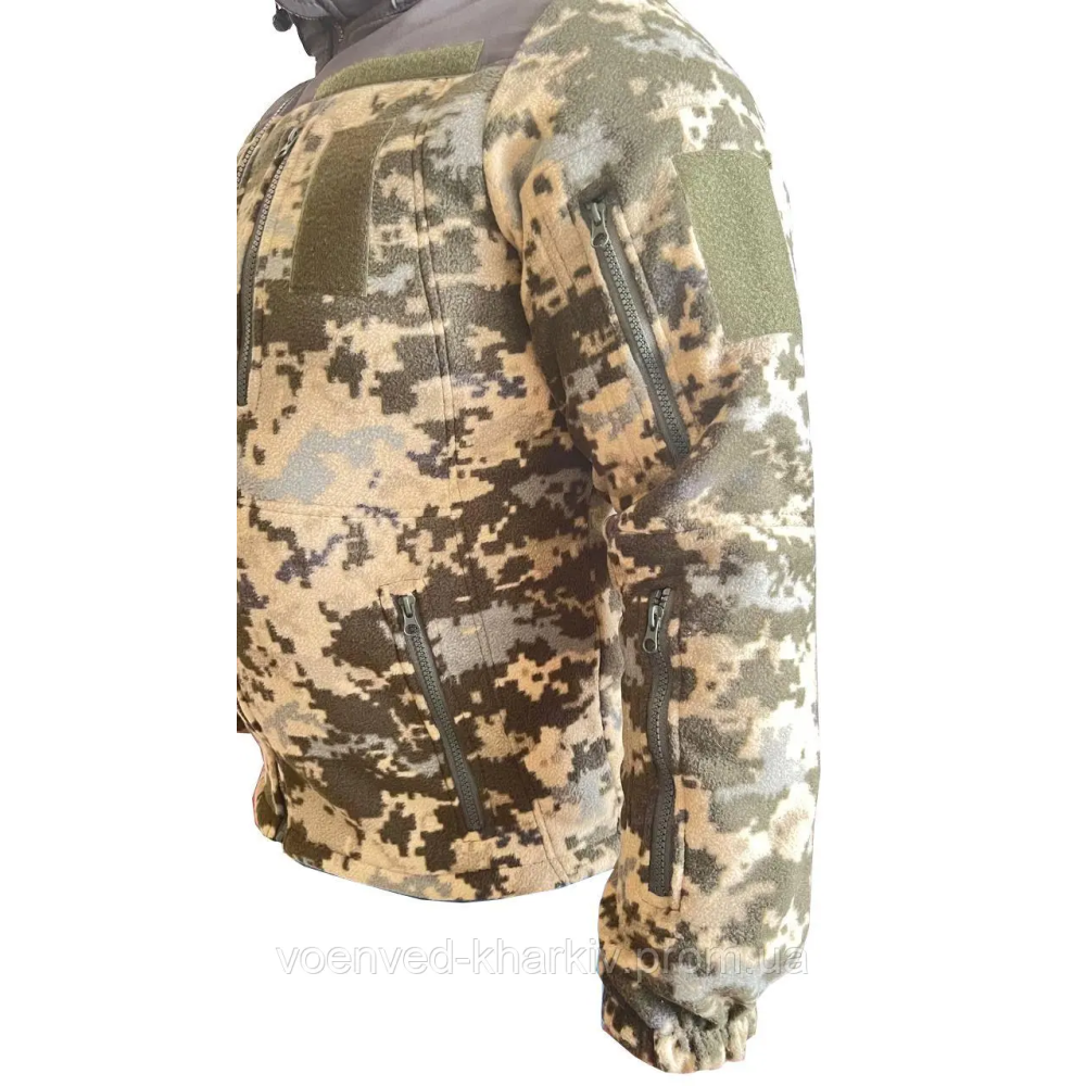 Тепла, м'яка флісова тактична кофта на блискавці ЗСУ піксель без капюшона з високим коміром виготовлена з тканини фліс щільністю 290 г/м2 -завдяки унікальним властивостям цього матеріалу, не вбирає вологу і швидко сохне, забезпечує теплоізоляцію навіть у найлютіші морози, водночас дозволяючи виводити зайве тепло та вологу (піт), що виділяється під час тренувань, утримує тепло, забезпечує надійний захист від вітру