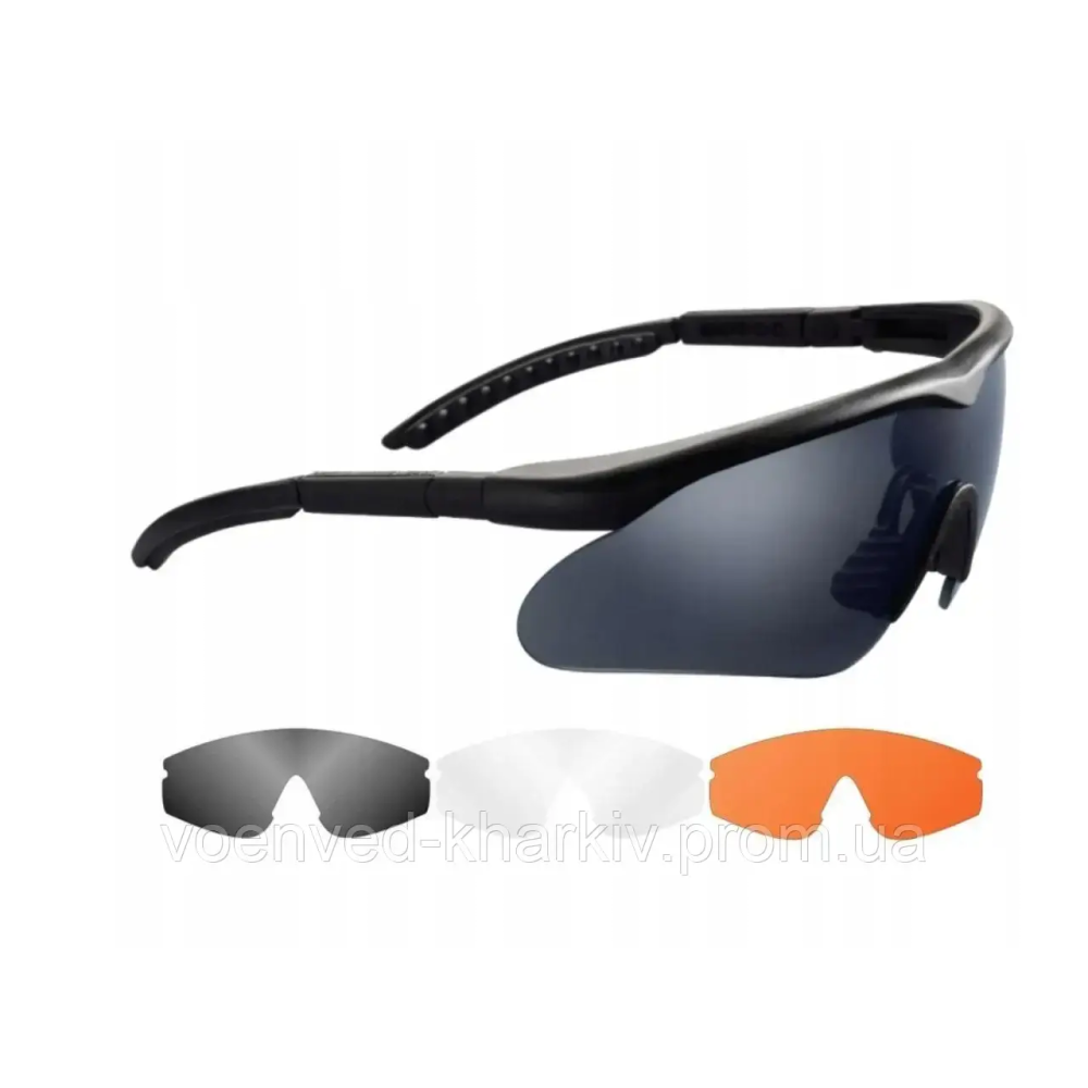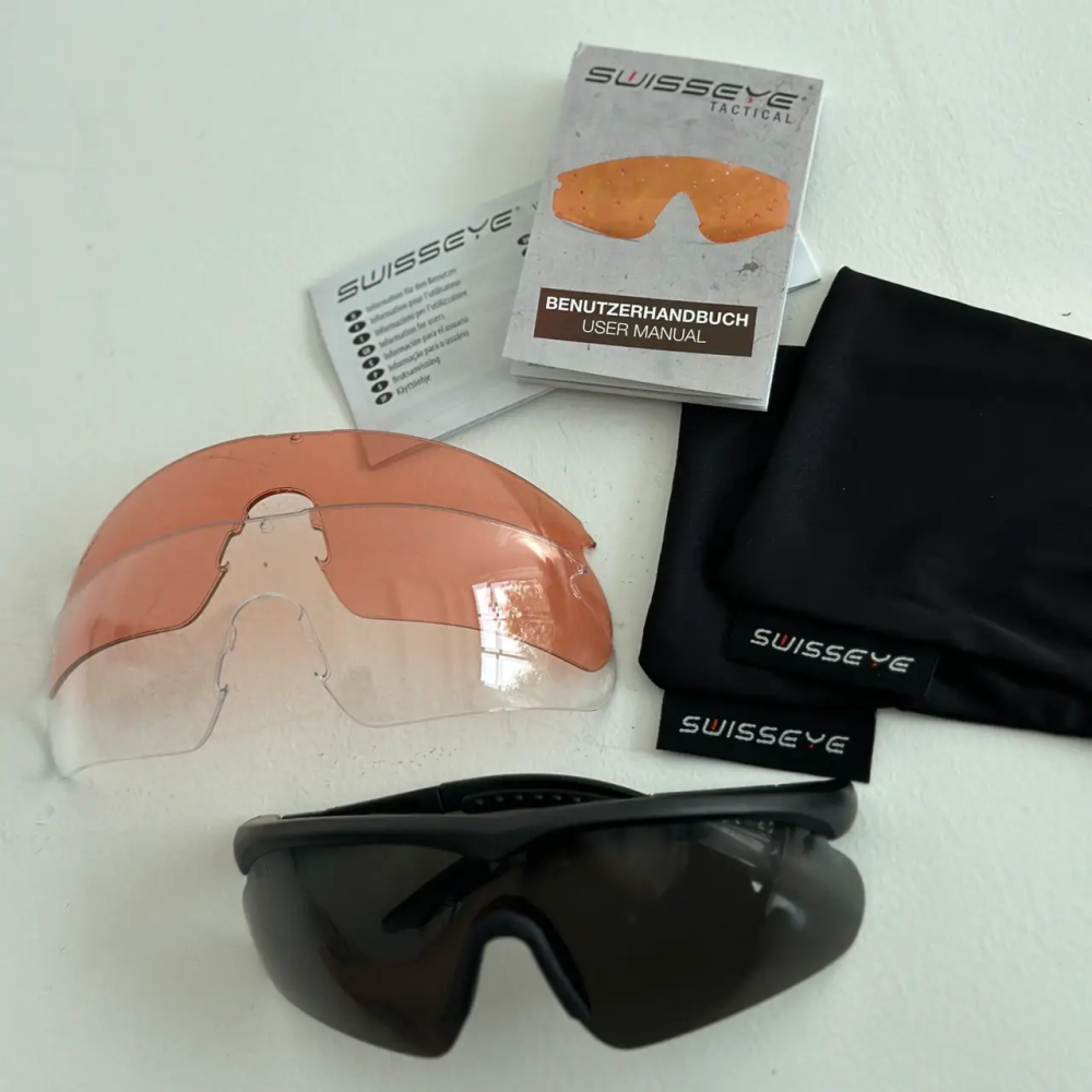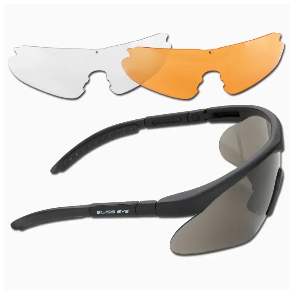 Тактичні окуляри Swiss Eye постачаються в комплекті з чохлом із мікрофібри та двома запасними лінзами (жовтогарячий і прозорий), що дає змогу стрілку адаптуватися під різні умови освітлення, створюючи надійний захист очей